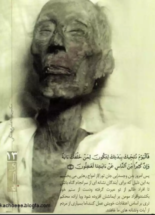 (فَالْیَوْمَ نُنَجِّیكَ بِبَدَنِكَ لِتَكُونَ لِمَنْ خَلْفَكَ آیَةً … وَإِنَّ كَثِیراً مِّنَ النَّاسِ عَنْ آیَاتِنَا لَغَافِلُونَ) (سوره یونس آیه 92)